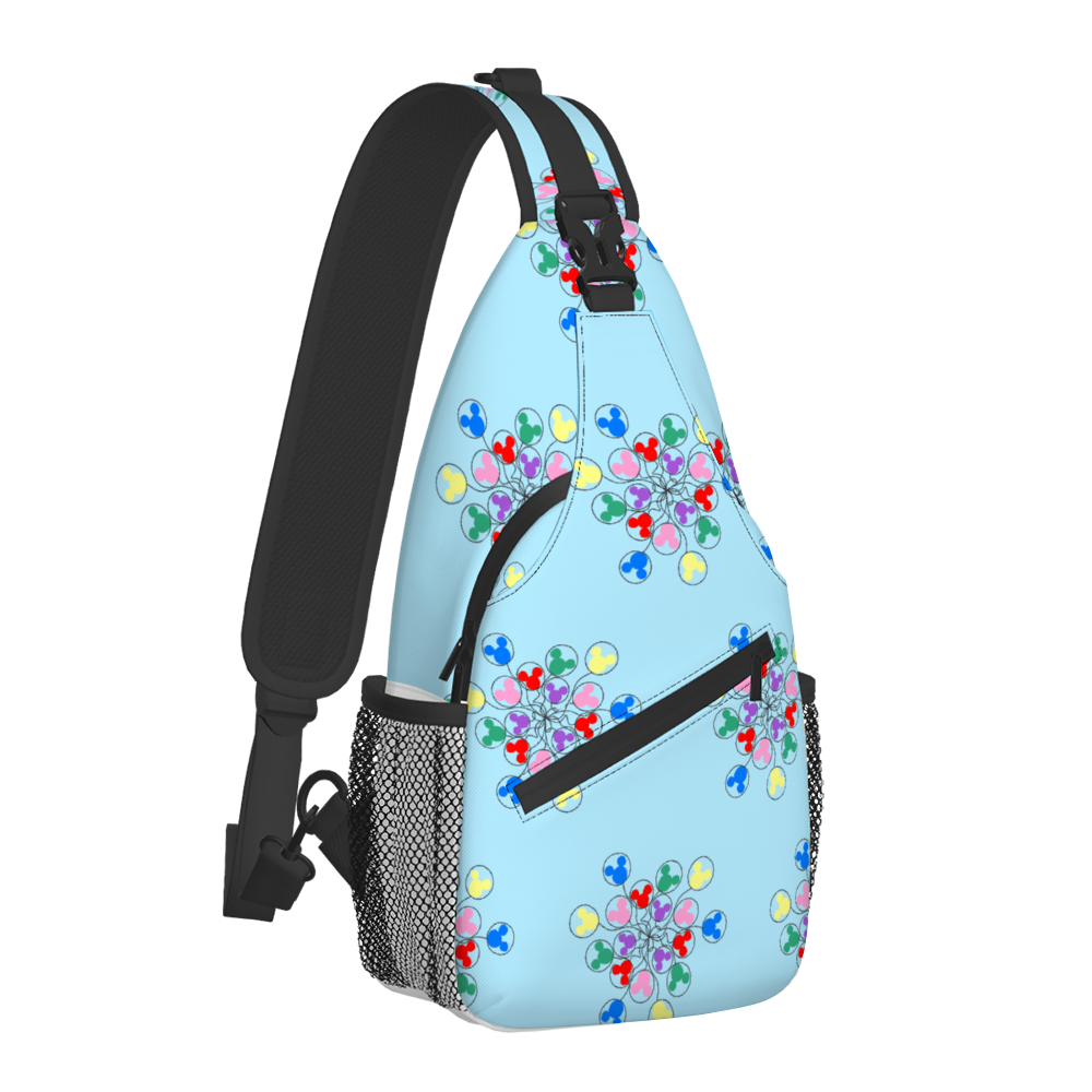 This bag is perfect for your next family vacation or everyday bag. It features my artwork printed on a super comfortable, versatile, and lightweight bag. This has an adjustable cushioned strap that is versatile beccause you can switch the hook to strap on the left or the right side, depending on which side you like to carry your bag. It has plenty of pockets and includes and easy to open buckle THAT IS PERFECT FOR HOLDING MOUSE EARS!! The one should strap allows you to easily swing the bag to the front when you are sitting down without taking it off.