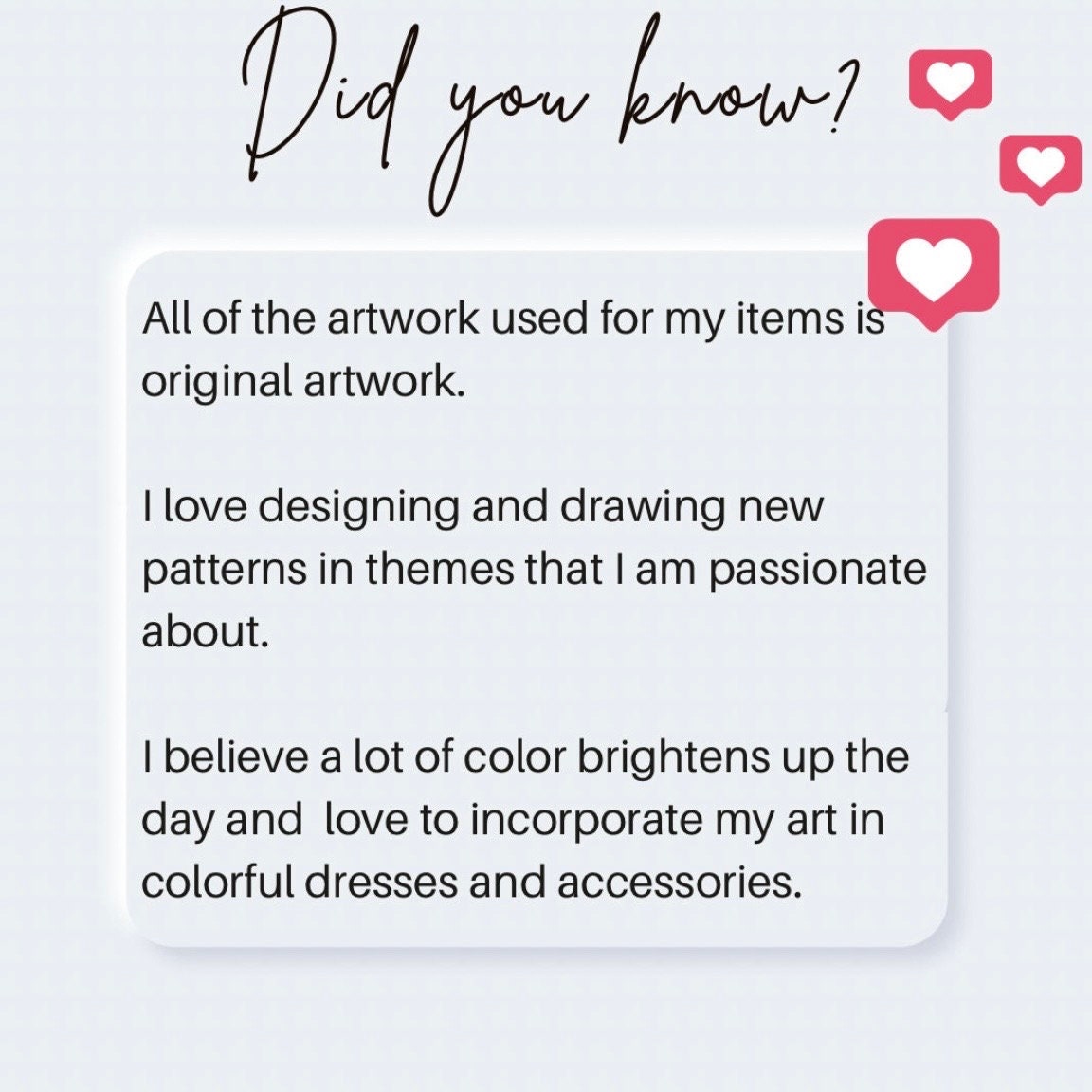 Much of the artwork on my clothing and accessories is hand drawn by me and printed on all of my items! Many of my items take 3 to 5 weeks from the time of order until delivery. Please make sure you order in advance for your vacations.